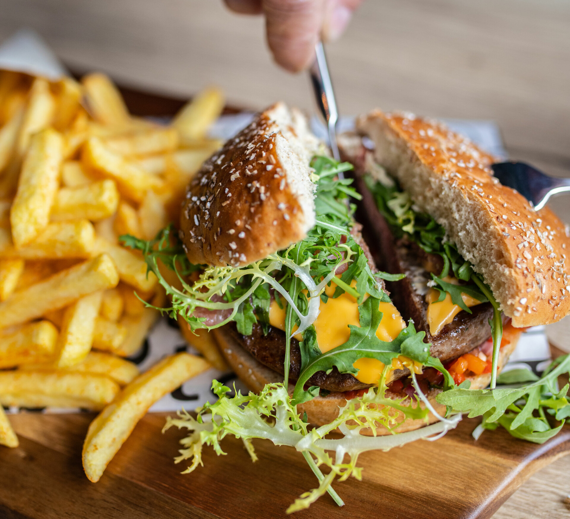 Deze burger kun je ook bestellen in een overheerlijke vegetarische variant.